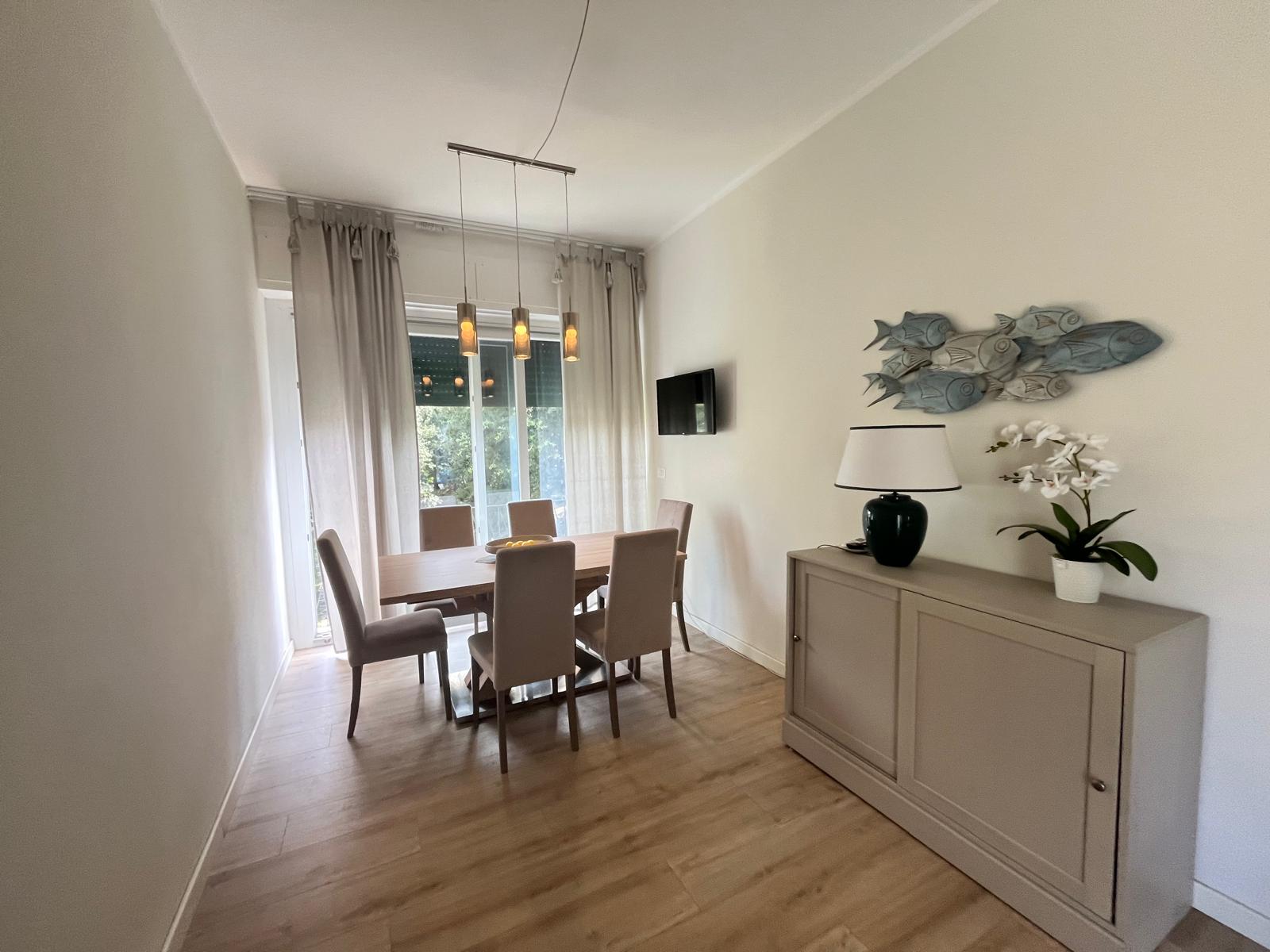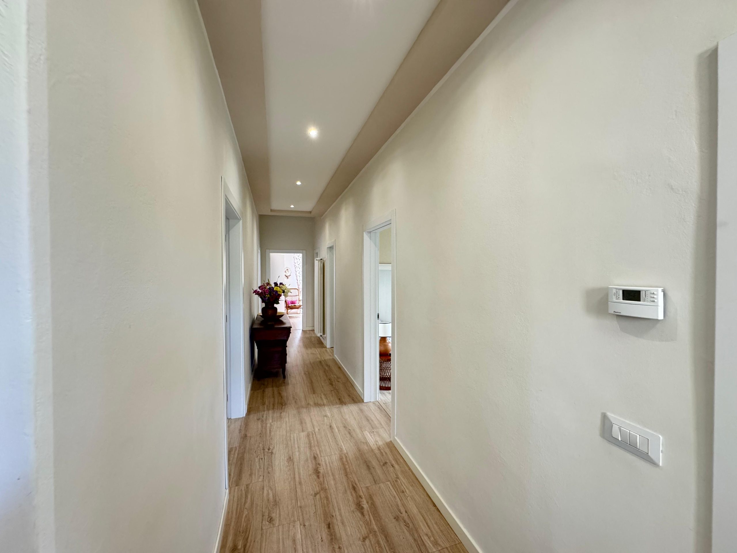 L’appartamento al piano primo si presenta come una soluzione spaziosa e luminosa, composta da un ampio soggiorno con balcone panoramico, una sala pranzo, una cucina abitabile, due camere matrimoniali confortevoli, uno studio versatile e due bagni funzionali.